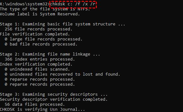 - 2.Copy and paste “chkdsk c: /f /r /x” and hit enter to run it.